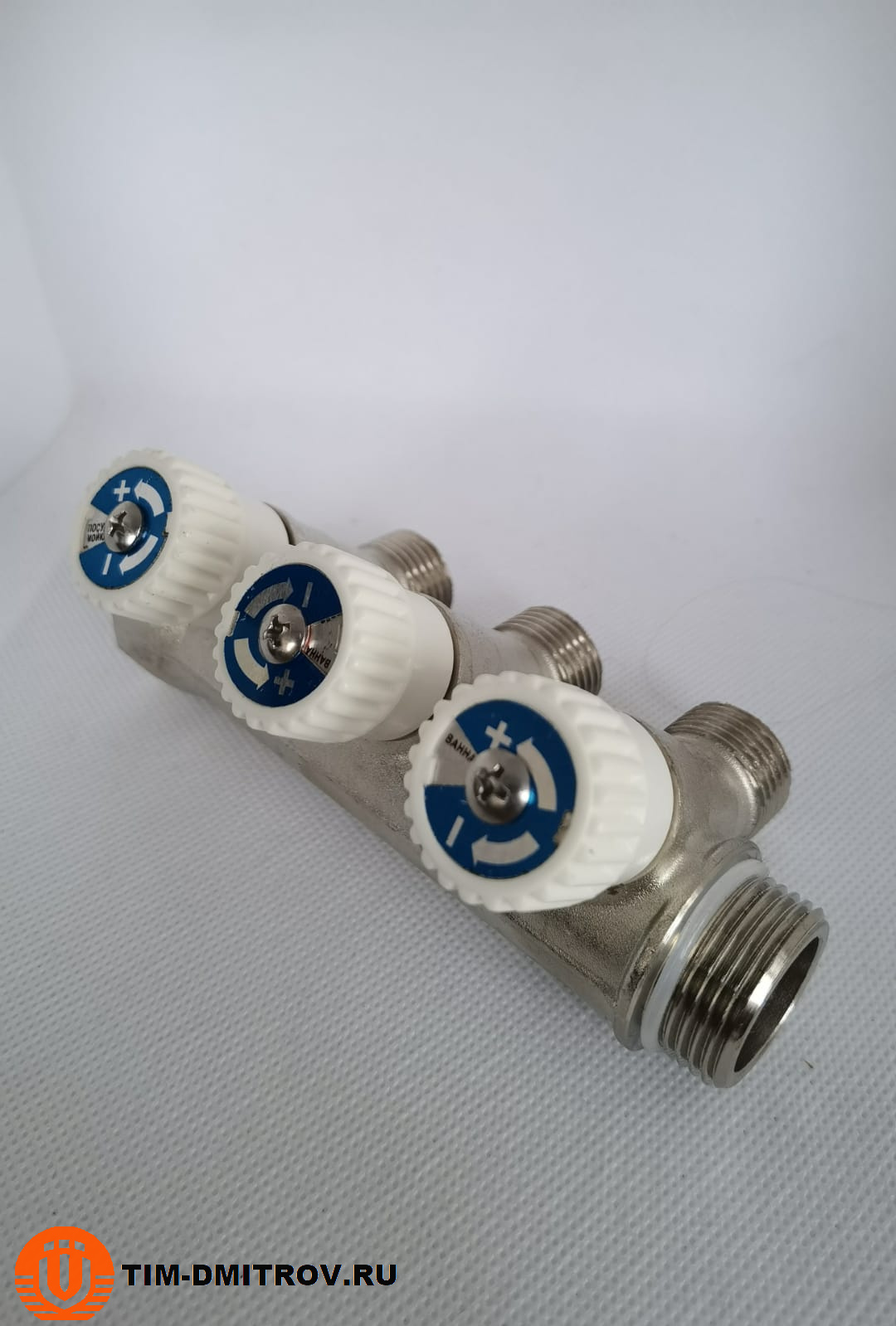 Коллектор с вентилями 135° никелированный под плоскую прокладку. 3/4*1/2 (3 выхода) MR135N-03-3F | TIM Инженерная сантехника