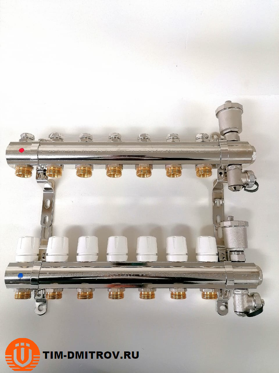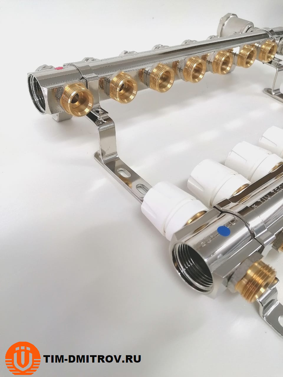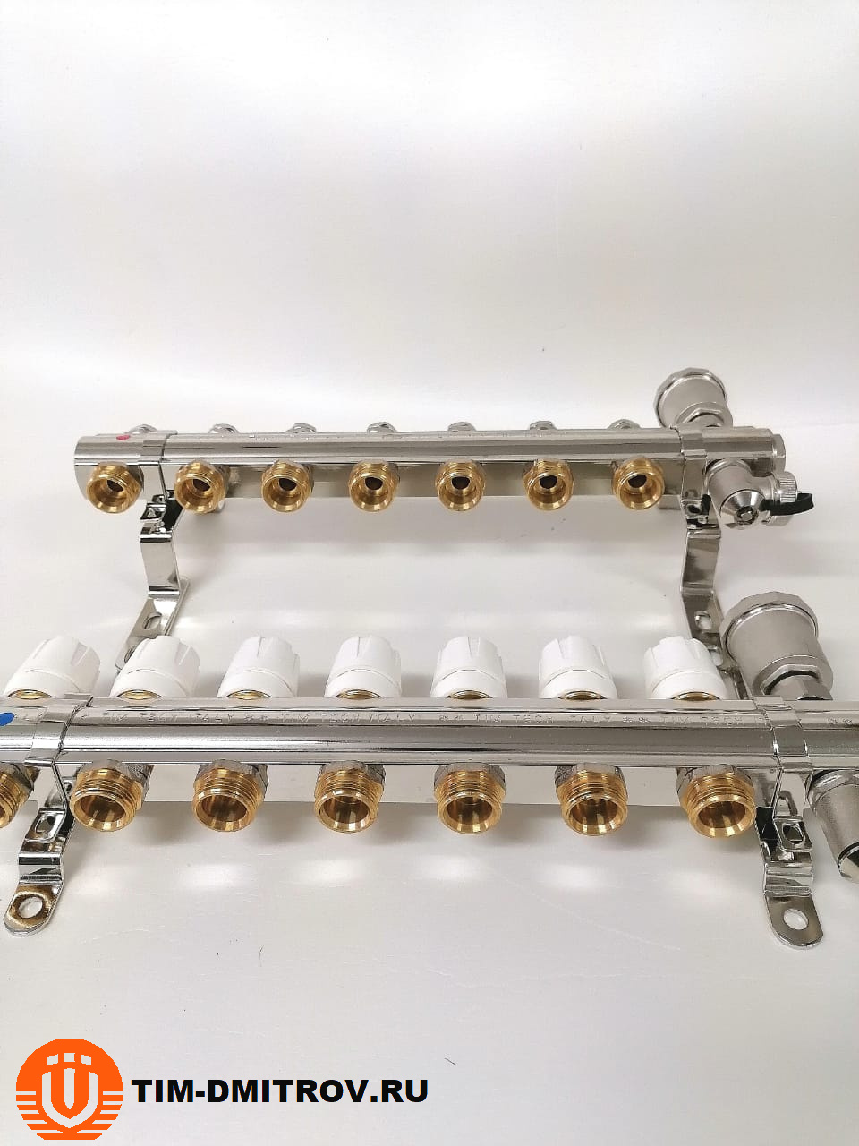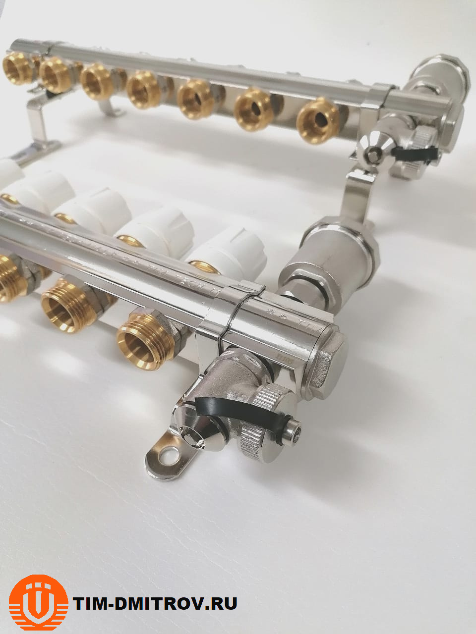 Выходы обратного коллектора блока TIM оборудованы термостатическими клапанами, а подающего – настроечными клапанами. Коллекторы оснащены воздухоотводчиками с отсекающими клапанами, дренажными кранами, самоуплотняющимися пробками. Стандарт присоединения труб – «евроконус». В комплект входят крепежные кронштейны.