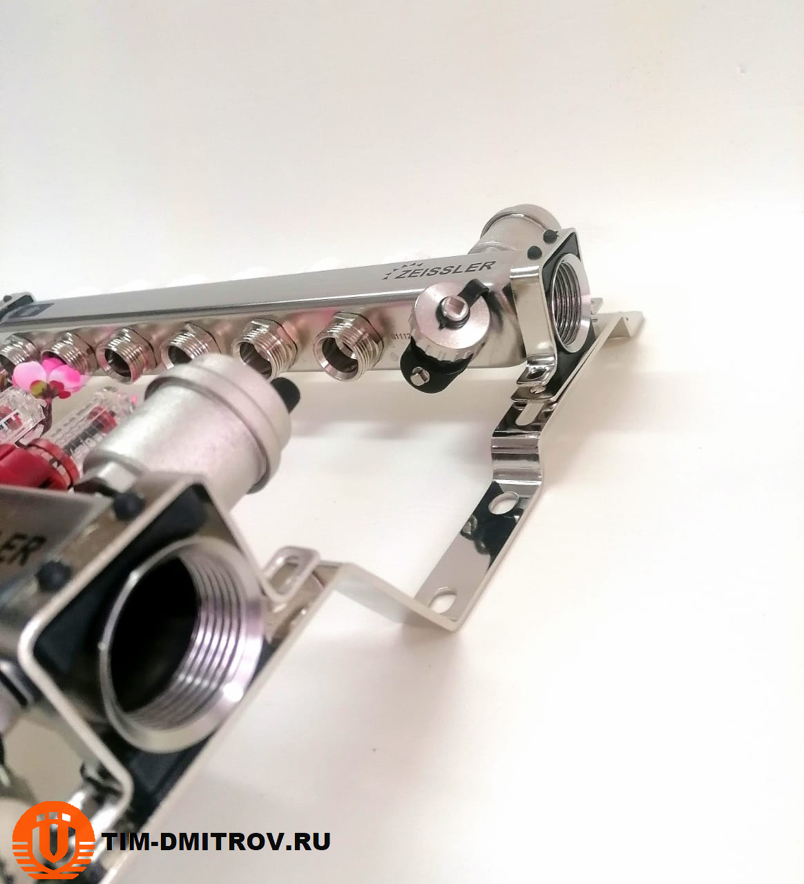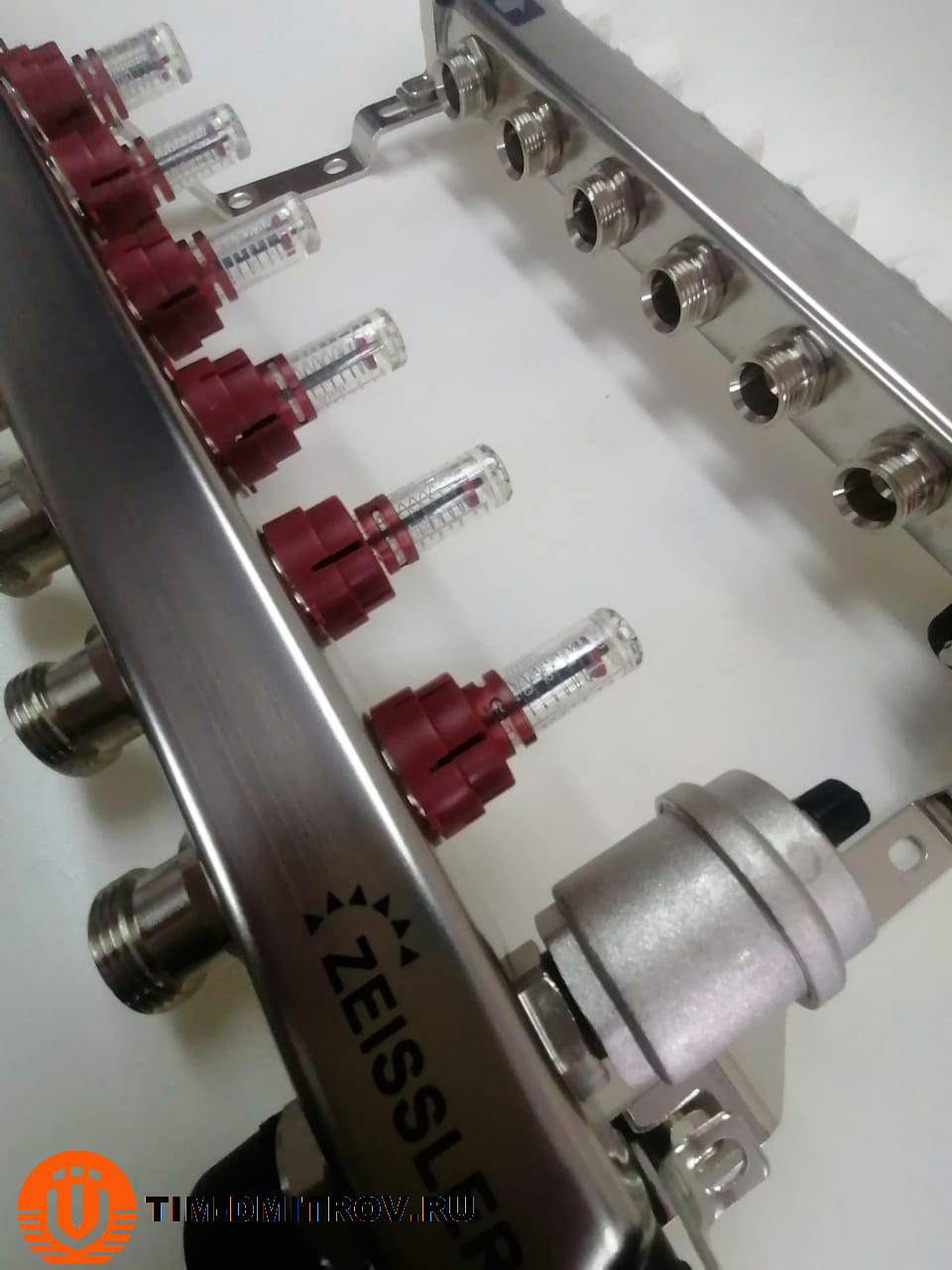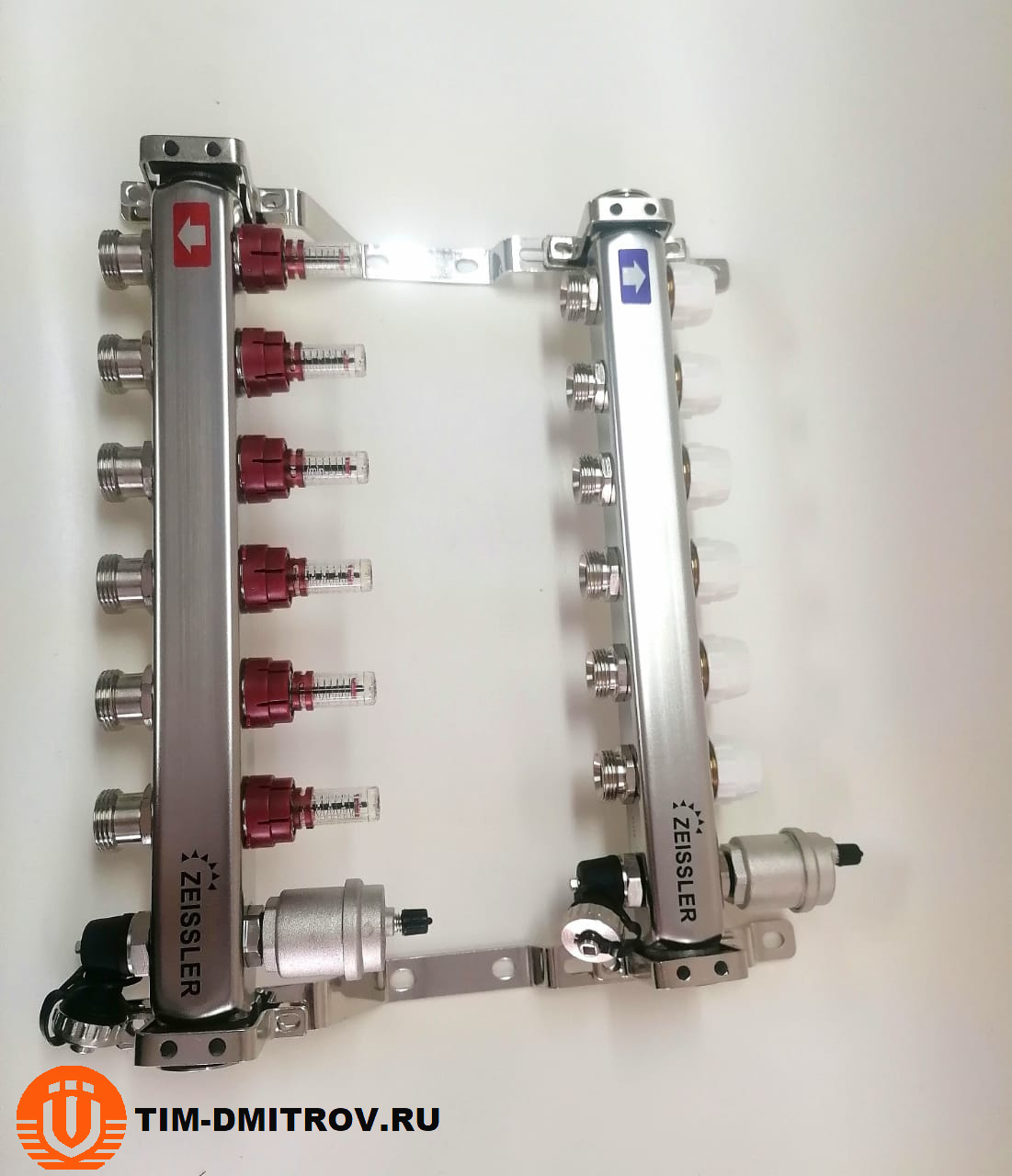 Распределительный коллекторный блок тип ZSc ZEISSLER состоит из подающей и обратной гребенок, каждая из которых имеет от 2 до 12 выходов. Подающая гребенка имеет возможность отключения (перекрытия) каждого отдельного контура системы отопления или теплого пола, для чего оснащается расходомерами, либо запорно-регулирующими клапанами. Обратная гребенка оборудуется терморегулирующими клапанами с предварительной настройкой пропускной способности. Терморегулирующие клапаны могут быть автоматизированы с помощью термоэлектрических сервоприводов. Для ограничения расхода теплоносителя на каждый отвод выполняется предварительная настройка пропускной способности.Коллекторы укомплектованы спускными кранами и автоматическими воздушными клапанами, устанавливаемыми в конце каждого коллектора.Регулирующие клапаны терморегуляторов могут приводиться в действие с помощью термоэлектрических приводов с посадочной резьбой М30 х 1,5.
