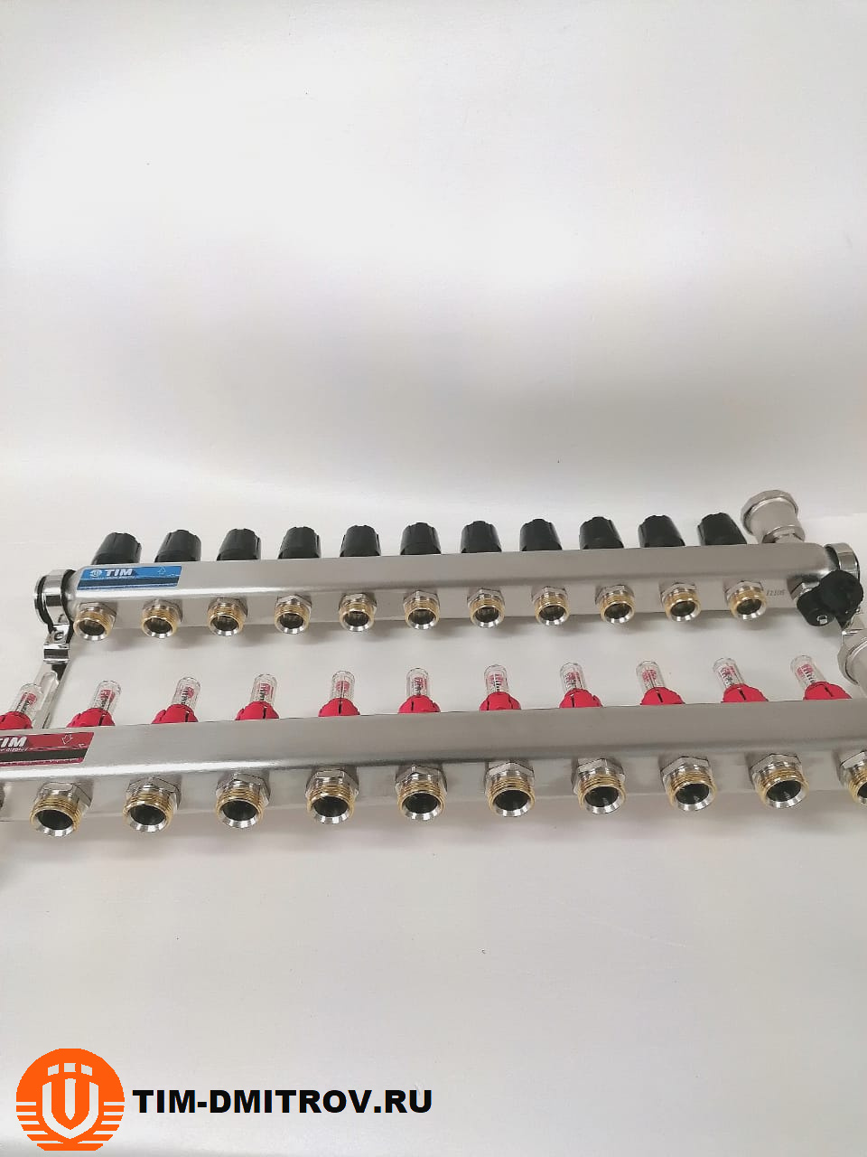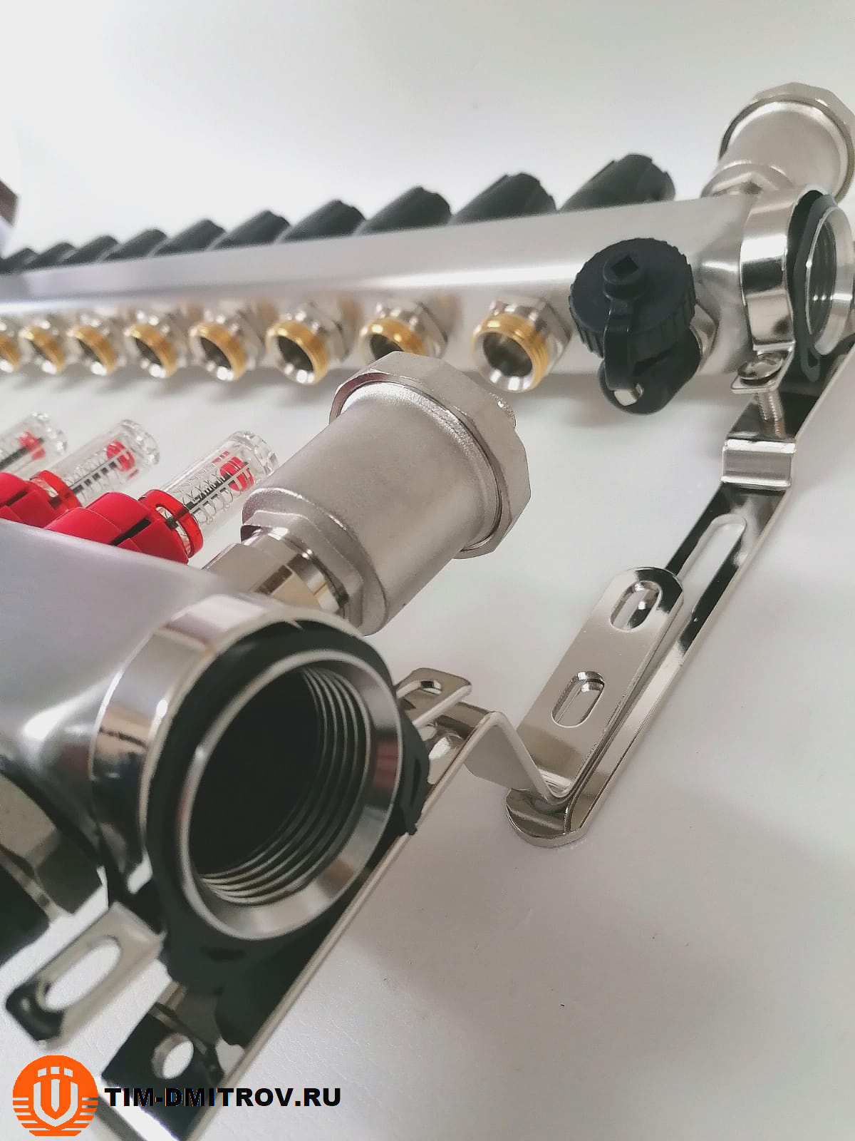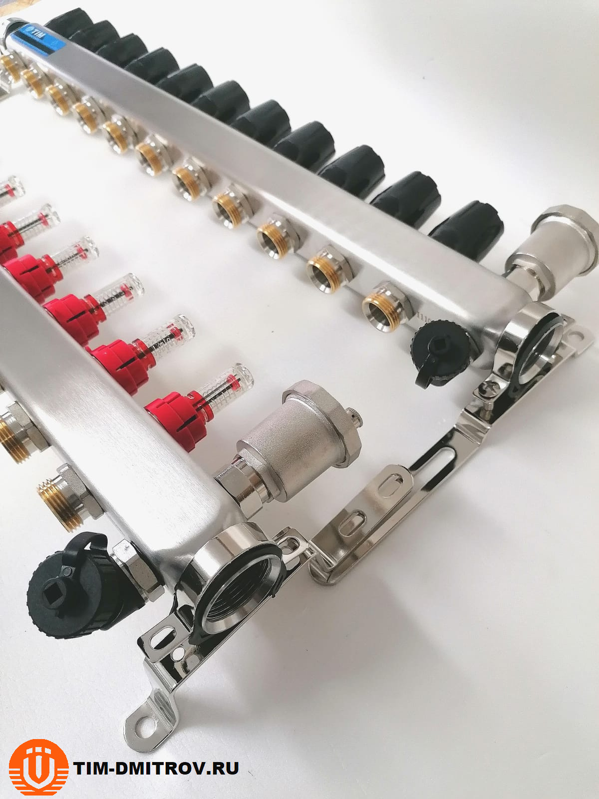 Подающий коллектор - со встроенными расходомерами (0.5 - 5 л/мин) , межосевое - 50 мм, выхода 3/4" евроконус, автоматический воздухоотводчик и сливной кран.