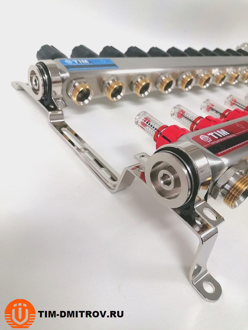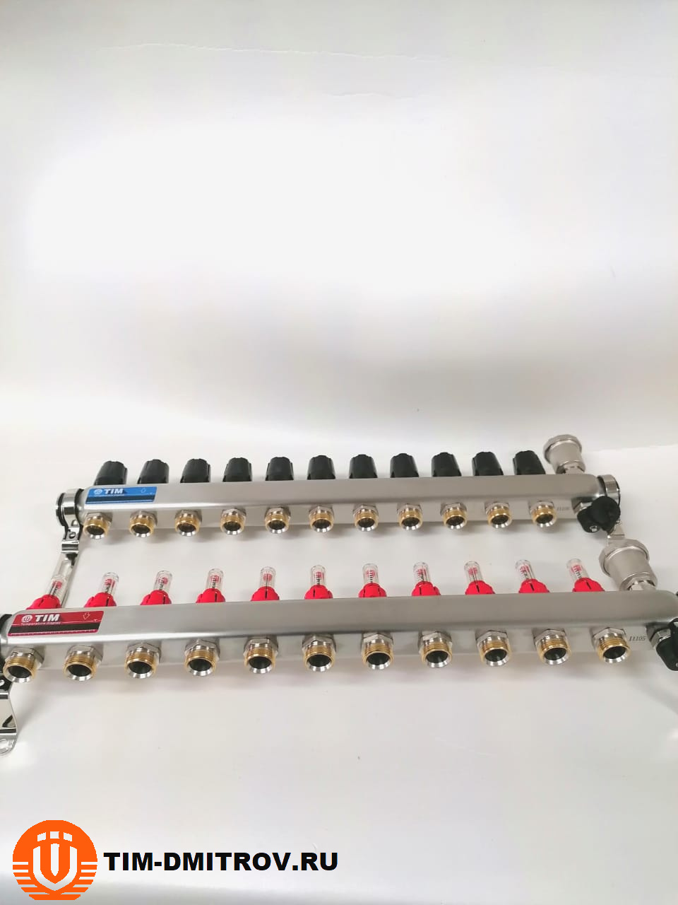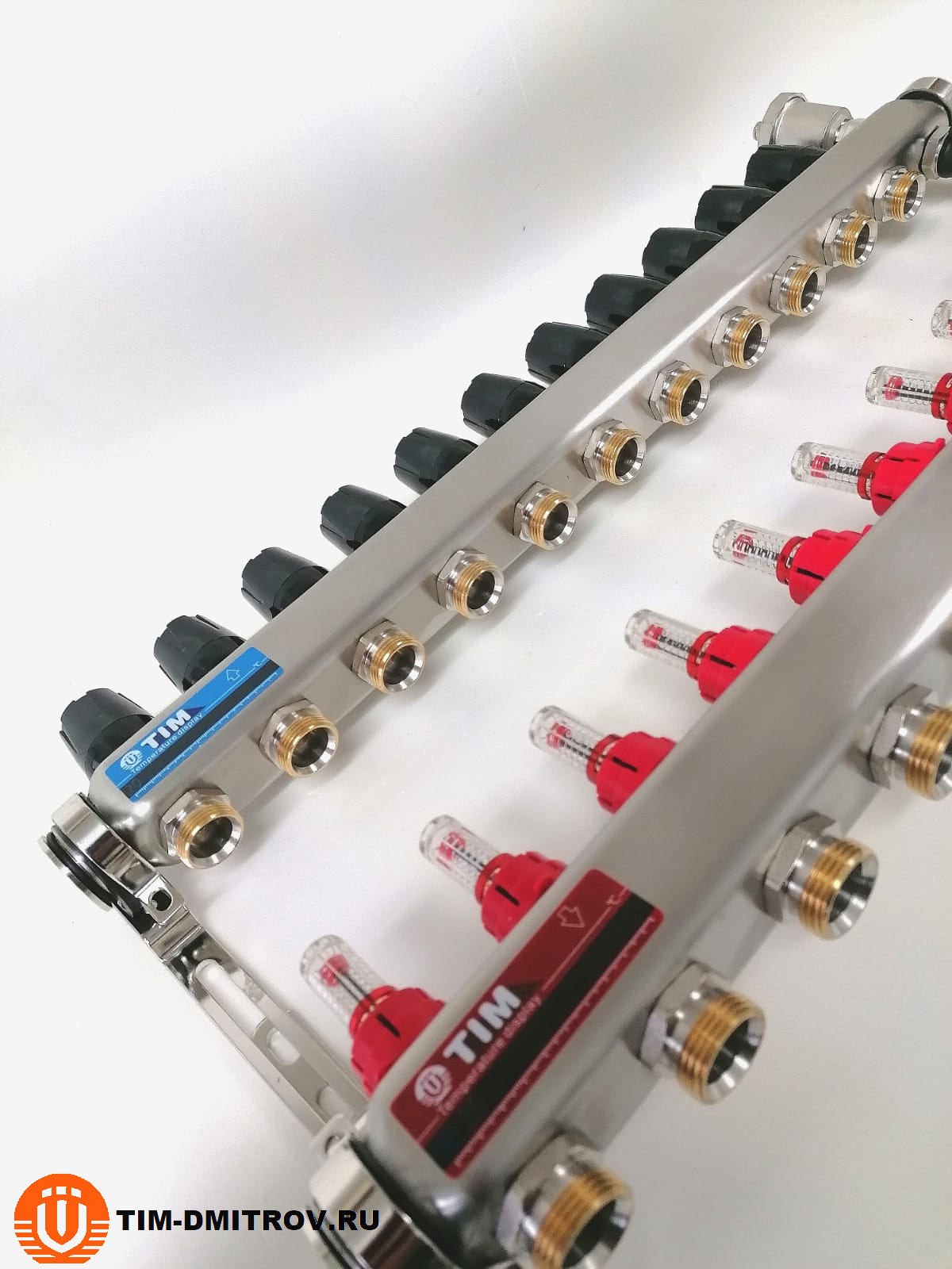 Подающий коллектор - со встроенными расходомерами (0.5 - 5 л/мин) , межосевое - 50 мм, выхода 3/4" евроконус, автоматический воздухоотводчик и сливной кран.