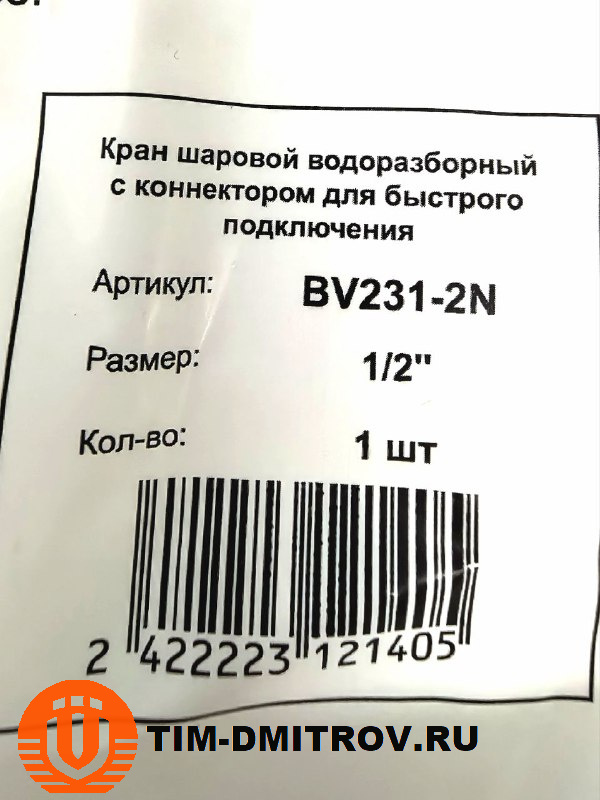 Кран шаровой водоразборный с коннектором для быстрого подключения 1/2, BV231-2N | TIM Инженерная сантехника