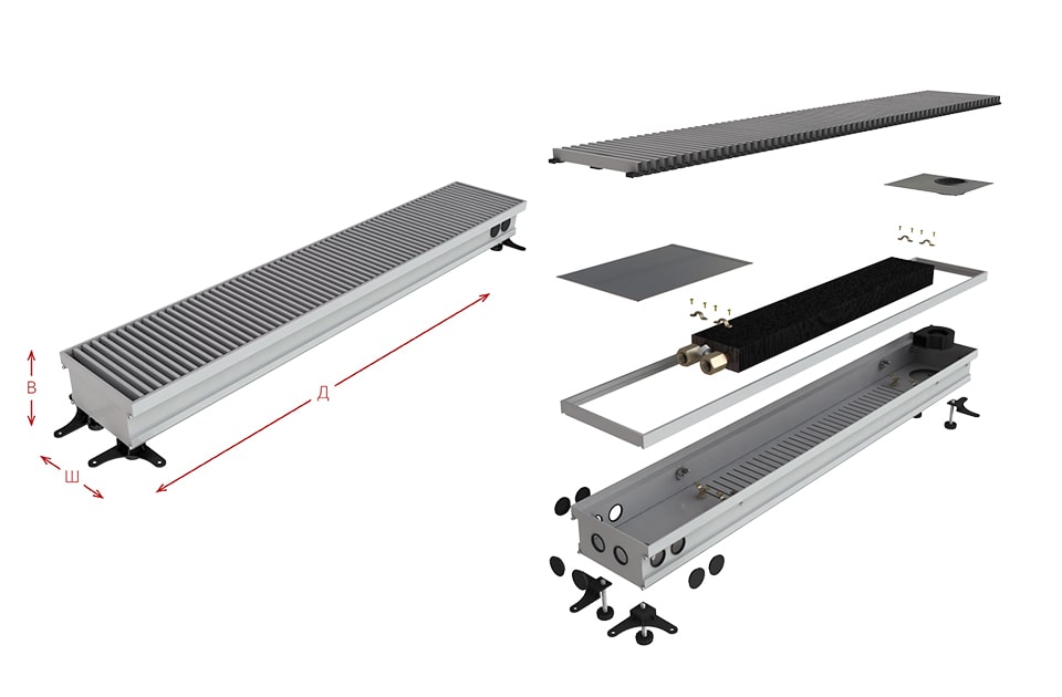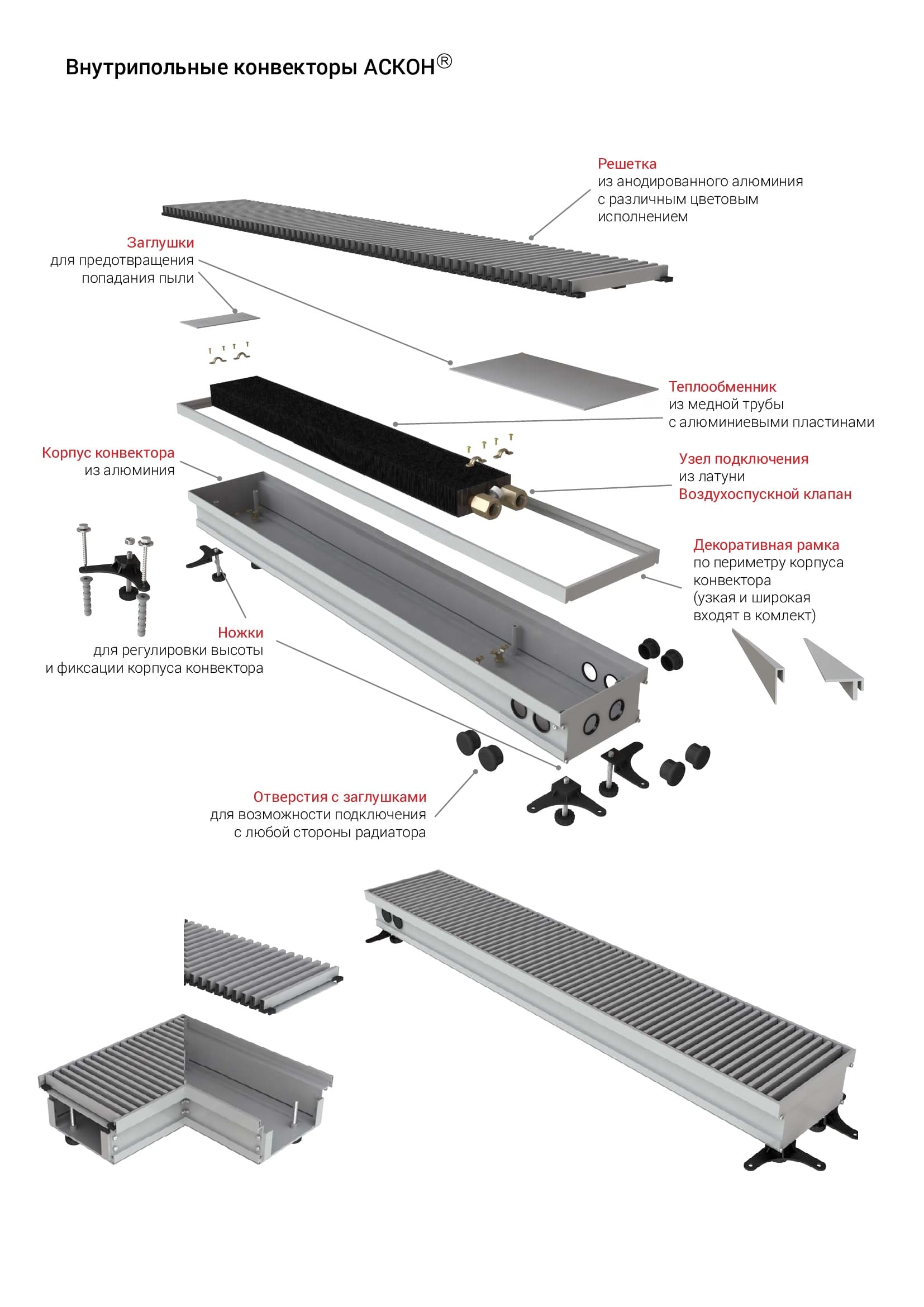 Конвектор RUB 150/400/4700 - это внутрипольный конвектор от компании АСКОН. Отличное решение для эффективного и быстрого обогрева помещения. С их помощью в помещении создается тепловой барьер, противостоящий холодным потокам воздуха от стеклянных стен и больших окон. Прекрасно встраиваются в структуру пола, оставаясь невидимыми невооруженному взгляду. Могут применяться для холодного кондиционирования. Конвекторы АСКОН рекомендуются для отопления жилых и нежилых помещений (с высокими окнами, витражами, террассами или стеклянными фасадами, в помещениях с бассейном, где традиционные отопительные приборы применить затруднительно). Конвекторы можно использовать в качестве самостоятельного или дополнительного источника тепла. Преимущества внутрипольных конвекторов ASKON: экономия энергии и высокая динамика отопления; повышенная теплоотдача и экологичность – корпус и декоративная решетка из алюминия; надежность – теплообменник из алюминиевого листа толщиной 0,5 мм; долговечность – труба теплообменника изготовлена из меди, D15 мм, толщина стенки 1мм.
